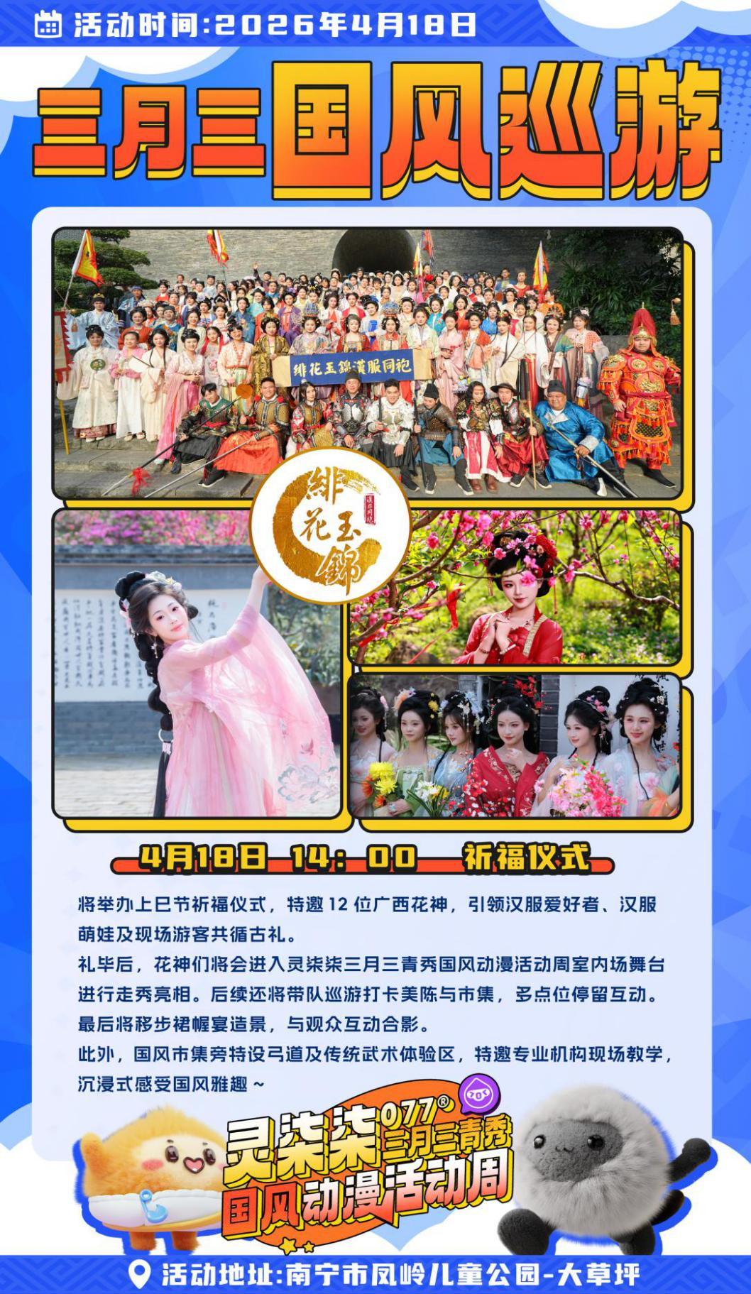4月17日:举办南宁动漫人创意圆桌会;联动中影年年展现AI动漫手艺,也有 Cos 签售、汉服巡逛、AI 互动、市集打卡等亲平易近项目,园区配套便平易近摆渡车、冷饮赠饮点、沉浸式拍摄布景等办事,本次勾当以 “AI赋能文化动漫畅逛八桂” 为从题,本次勾当周分财产启航(4月15日—17日)取国风动漫嘉韶华(4月18日—19日)两大板块,鞭策 “科技 + 文化 + 旅逛” 深度融合,以 “AI+文旅 +体验” 为焦点模式。14点举行三月三上巳节祈福典礼;